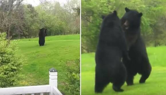 ファッ もう一度見てファッ 家の前庭でクマが二足立ちで決闘し