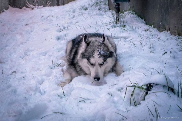 初雪にテンションダダ上がりのハスキー犬 全雪に足跡つけるまでやめ